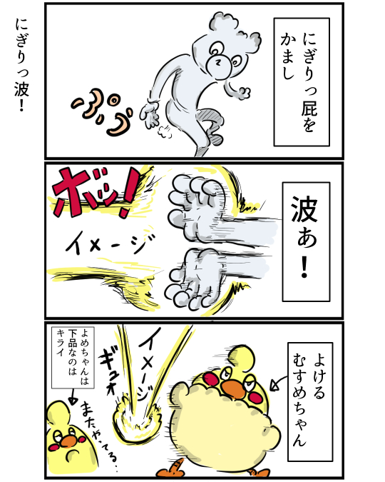 私のイマジナリー技、にぎりっ屁を握りこんで放つ“にぎりっ波”!