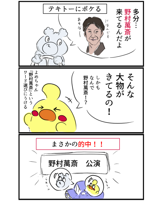私『たぶん、野村萬斎が来てるんだよ』と小ボケ。