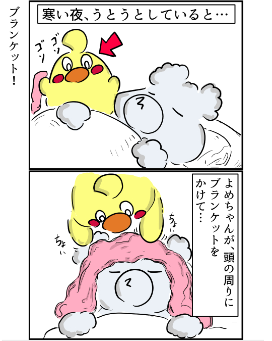 よめちゃんが、そっとブランケットを頭に巻いてくれました。